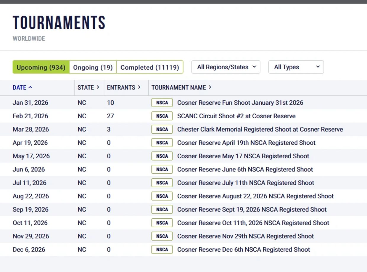 All 2026 Cosner Reserve Registered Shoot Tournaments are now live in ScoreChaser. Just head to scorechaser.com and search Cosner to find and sign up.